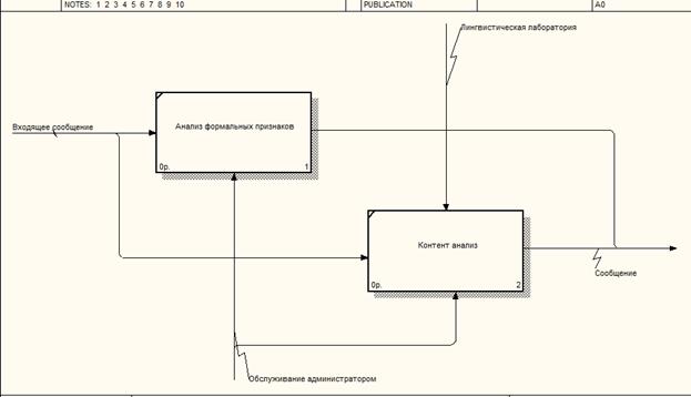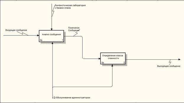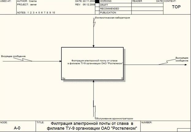 Данную схему можно представить в BPwin. На главном блоке изображен сервер фильтрации электронной почты от нежелательной корреспонденции в филиале ТУ – 9 организации ОАО «Ростелеком». В данном сервере входящей информацией является входящее сообщение. Выходящей информацией является выходящее сообщение. Так же в сервер фильтрации входит лингвистическая лаборатория с базами спама. Данная схема представлена на рисунке 1.