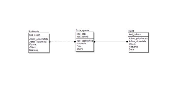 Эта модель сущность-связь построена по технологии ERD в системе моделирования ERwin. Данная диаграмма предназначена для проектирования базы данных. Данная схема представлена тремя сущностями каждая. В первой таблице под названием База спама содержатся атрибуты: код базы, код пакета, код сообщения, название, дата, объем. Во второй таблице Пакет содержатся атрибуты: код пакета, адрес пакета, адрес отправителя, объем, название, дата. В третьей таблице под названием Сообщение содержатся атрибуты: адрес получателя, адрес отправителя, формат, объем, название.
