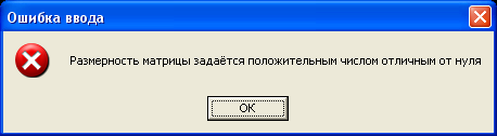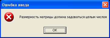 - в поле ввода размерности матрицы вводится нечисловое значение. В этом случае появляется сообщение об ошибке, которое имеет вид, представленный на рисунке 1: