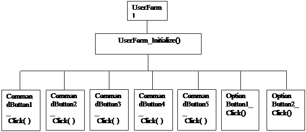 В данной диаграмме UserForm_Initialize() – процедура инициализации пользовательской формы. CommandButton1_Click() – процедура, срабатывающая при нажатии кнопки «Заполнить матрицу», которая производит проверку правильности ввода размерности матрицы, заполнение матрицы и вывод её на пользовательскую форму. CommandButton2_Сlick() – процедура, срабатывающая при нажатии кнопки «Очистить», которая очищает форму. CommandButton3_Сlick() – процедура, срабатывающая при нажатии кнопки «Выйти», позволяющая пользователю завершить работу с программой. CommandButton4_Click() – процедура, срабатывающая при нажатии кнопки «О программе», которая даёт краткие сведения о программе и её разработчике. CommandButton5_Сlick() – процедура, срабатывающая при нажатии кнопки «Работать с Excel», позволяющая пользователю переключиться на работу с листом Excel. OptionButton1_Click() – процедура-переключатель, при выборе которого вычисляется сумма элементов, находящихся под главной диагональю. OptionButton2_Click() – процедура-переключатель, при выборе которого вычисляется сумма элементов, составляющих главную диагональ.