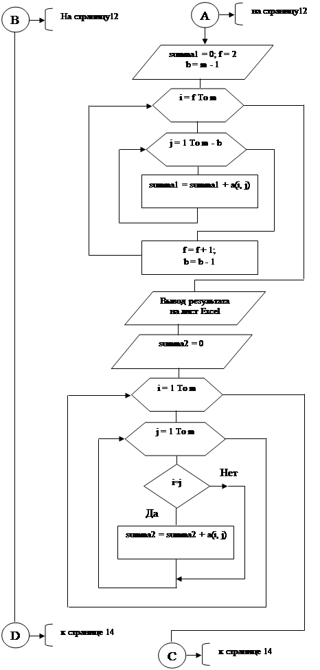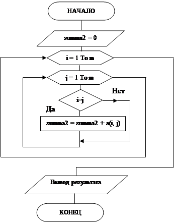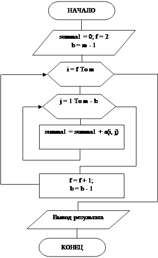 – суммируются элементы, начиная со второй строки, и, при увеличении строки на 1, число столбцов, содержащих нужные элементы, также увеличивается на 1. В кратком виде этот цикл выглядит так: i=f…m, где начальное f=2; j=1…(m-b), где начальное b=m-1. При каждой последующей итерации значение f увеличивается на 1, а значение b на 1 уменьшается.