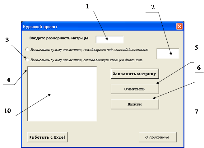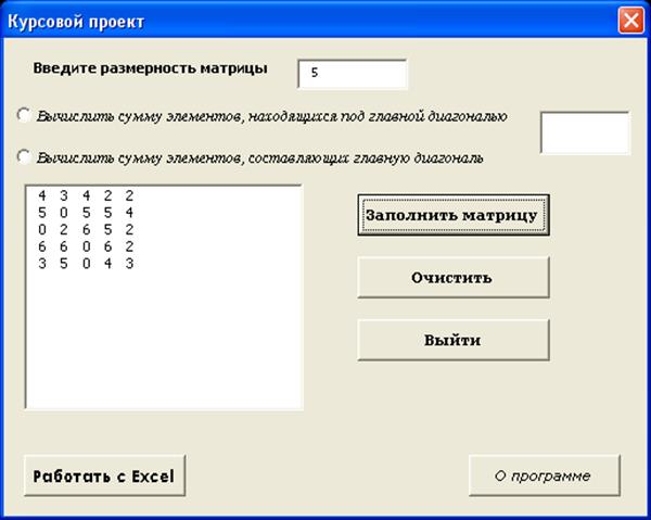 В данном курсовом проекте с помощью языка программирования Visual Basic for Application был разработан программный модуль, который позволяет: задавать квадратную матрицу и программно заполнять её случайными числами от 0 до 6; вычислять сумму элементов находящихся под главной диагональю; вычислять сумму элементов составляющих главную диагональ. Был предусмотрен режим работы с листом Excel.