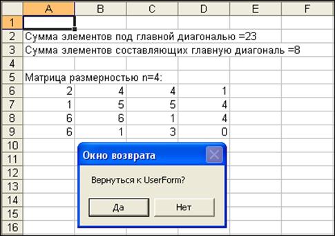 Cells(2, 1) = "Сумма элементов под главной диагональю =" & summa1