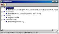 С помощью этого окна вы сможете получить доступ к Web-страницам корпорации Inprise для просмотра самой свежей информации о корпорации и ее программных продуктах, копирования дополни тельных файлов, чтения ответов на наиболее часто задаваемые вопросы и т. д. При повторных запусках Delphi это окно появляется автоматически с некоторой периодичностью, определяемой настройками на странице окна Tolls | Environment Options, связанной с закладкой Delphi Direct. Вы также сможете его вызвать в любой момент с помощью опции Help | Delphi Direct главного меню.