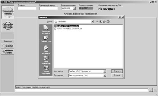 1) Пользователь нажимает кнопку «Считать сигналы» и выбирает текстовый файл с данными по сигналам, экспортированный из SCADA Realflex. Программа на основании данных из файла составляет список изменений, планируемых к внесению в базу данных проекта на основании вводимой заявки.