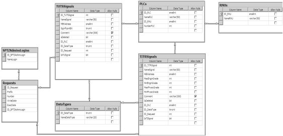 Уникальные ключи также были назначены отношениям RNUs (NameRNU), PLCs (NamePLC), DataTypes (NameDataType) и SPTZAdminsLogins (NameLogin).