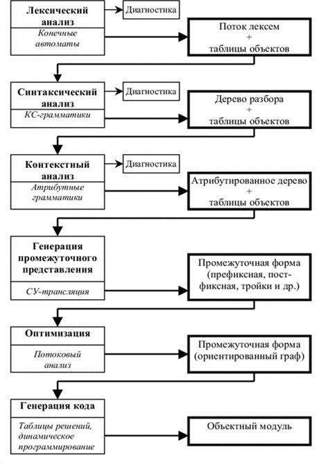Конечно, те или иные фазы транслятора могут либо отсутствовать совсем, либо объединяться. В простейшем случае однопроходного транслятора нет явной фазы генерации промежуточного представления и оптимизации, остальные фазы объединены в одну, причем нет и явно построенного синтаксического дерева.