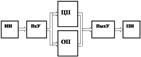 Любая ЭВМ также представляет собой информационную систему, которую можно рассматривать как канал преобразования информации (см. рис. 2). На схеме введены обозначения: ИИ и ПИ – соответствен-но источник и приемник информации; ЦП – центральный процессор; ОП – оперативная память; Вх. У и Вых. У – соответственно входное и выходное устройства, которые осуществляют функции кодирования и декодирования.