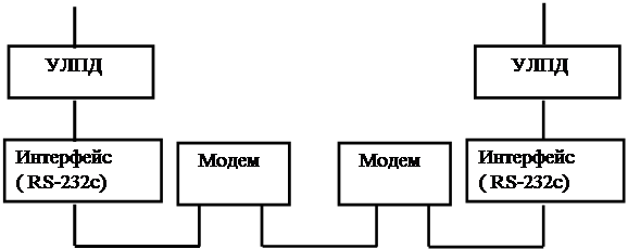 Система передачи данных включает: аппаратуру передачи данных (АПД); модуль управления линией передачи данных (УЛПД); модем – модулятор и демодулятор, объединенные в одном устройстве; интерфейс – унифицированная система сопряжения. В СПД используются различные типы интерфейсов (например, RS‑232c и др.).