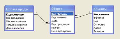 Вначале заполняются форма «Клиенты» (рис. 7), форма «Готовая продукция» (рис.8), затем форма «Оборот» заполняют по данным клиентов и готовой продукции (рис. 9). По этим данным формируется запрос и отчет.