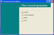 Также база данных содержит формы: «Кнопочная форма» - обобщающая форма, в ней содержатся кнопки, «Клиенты», «Готовая продукция», «Оборот». Они помогают предоставить пользователю средства для заполнения только тех полей, которые ему заполнять положено. Одновременно с этим в форме размещены специальные элементы управления (счетчики, раскрывающиеся списки) для автоматизации ввода.