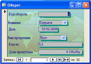 Заполняются все поля кроме «Код оборота» т.к. эти поля заполняются автоматически. Заполнения полей «Фамилия» и «Вид продукции» осуществляются путем выбора из раскрывающегося списка после нажатия на кнопку