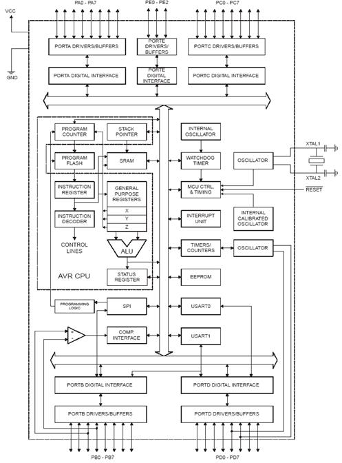 В данной расчетно-графической работе будет рассмотрен микроконтроллер ATmega161. Для этого необходимо знать архитектуру БИС и микропроцессорного комплекта, представлять взаимодействие БИС в системе и овладеть программированием, прежде всего на языке ассемблера.