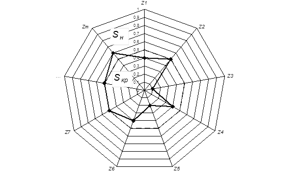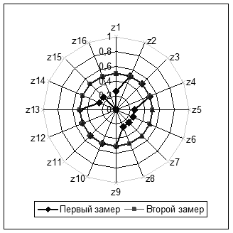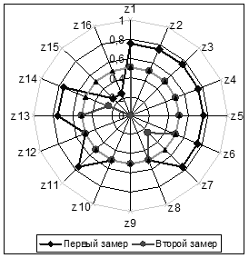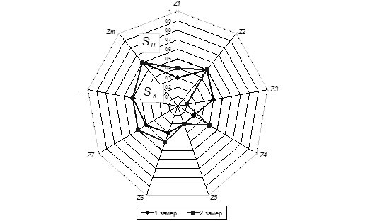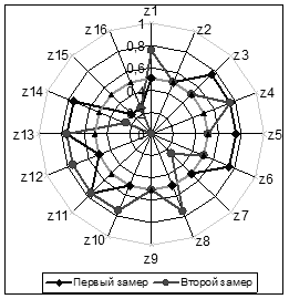 Для визуализации результата измерений в системе реабилитации используется лепестковая диаграмма, на которой кроме полученных данных может быть представлена дополнительная нормативная информация в числовой и интервальной форме [3]. Диаграмма строится, используя значения переменных zi