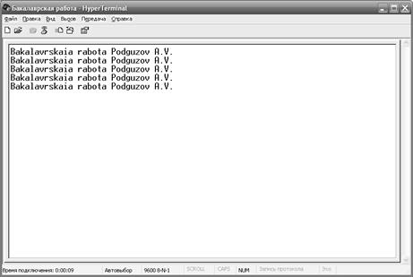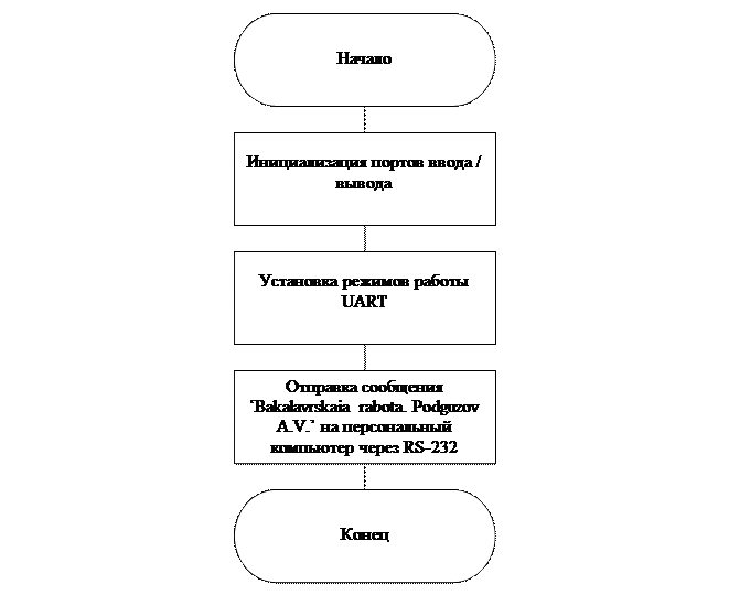 Помимо этого, для тестирования интерфейса RS-232 и протокола USART, были разработаны алгоритм и программа для связи персонального компьютера с микроконтроллером PIC16F628A через приемопередатчик MAX232. При каждом сбросе микроконтроллера управляющая программа передает на персональный компьютер строку ASCII символов.