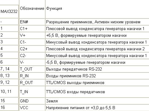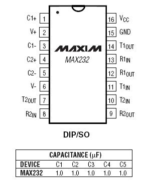 Микросхема приемопередатчика MAX3232 оснащена фирменным выходным каскадом передатчиков, обеспечивающим малое падение напряжения и полную совместимость с требованиями стандарта RS-232 при напряжении питания от 3,0 до 5,5 В. Формирование выходного сигнала, при использовании одного положительного напряжения питания, обеспечивается двумя встроенными генераторами накачки, для работы которых достаточно четырех внешних малогабаритных конденсаторов емкостью по 0,1 мкФ.