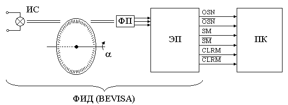 Основным элементом ФИД является прозрачный диск с нанесенными на него рисками, количество которых достигает нескольких тысяч. При повороте диска, луч света, излучаемый источником ИС, модулируется рисками и воспринимается фотоприемниками ФП. Электрические сигналы от ФП преобразуются электронным преобразователем ЭП в систему электрических сигналов, которые подаются на программируемый логический контроллер ПК.