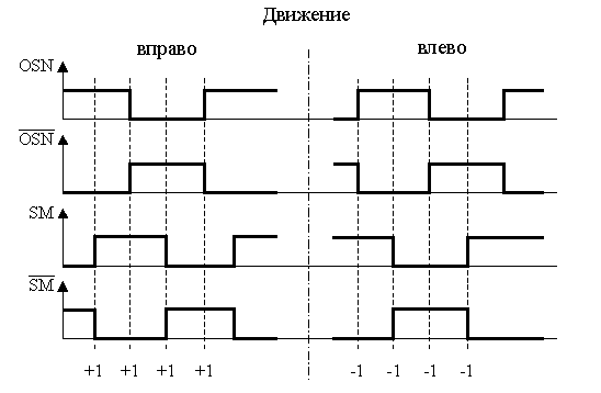 Диаграмма этих сигналов при вращении вправо и влево показана на рисунке К.2. Программно-аппаратное обеспечение ПК организовано так, что при движении вправо при каждом переходе входного сигнала происходит прибавление "1" в программном или аппаратном счетчике, а при движении влево – вычитание "1". Кроме того, ПК проверяет отсутствие обрыва линии, сравнивая сигналы с их инверсиями. Таким образом, в счетчике ПК формируется код угла поворота Na или его приращения.