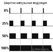 При регулировании скорости вращения двигателя с помощью широтно-импульсной модуляции (ШИМ, в англоязычных текстах - PWM, pУLse-width modУLation) на двигатель подается полное напряжение питание, но регулируется время, в течение которого оно подается. Широтно-импульсная модуляция представлена на рисунке Л.1.