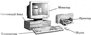 К системному блоку подключены клавишное устройство (клавиатура), монитор (другое название – дисплей) и мышь (манипулятор). Иногда используются другие типы манипуляторов: джойстик, трекбол и пр. Дополнительно к ПК могут быть подключены: принтер (устройство печати), модем (для выхода на телефонную линию связи) и другие устройства (рис. 1).