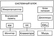 Рис. 2. Минимальный комплект устройств ПК. КМ – контроллер монитора, КК – контроллер клавиатуры, КМш – контроллер мыши