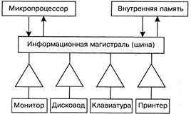 Магистральный принцип взаимодействия устройств ПК. Принцип, по которому организована информационная связь между процессором, оперативной памятью и внешними устройствами, похож на принцип телефонной связи. Процессор через многопроводную линию, которая называется магистралью (другое название – шина), связывается с другими устройствами (рис. 3).