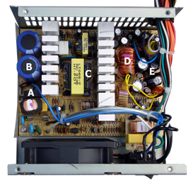 Импульсный блок питания компьютера (ATX) со снятой крышкой A — входной выпрямитель. Ниже виден входной фильтр B — входные сглаживающие конденсаторы. Правее виден радиатор высоковольтных транзисторов C — импульсный трансформатор. Правее виден радиатор низковольтных ключей D — катушка выходного фильтра E — конденсаторы выходного фильтра |