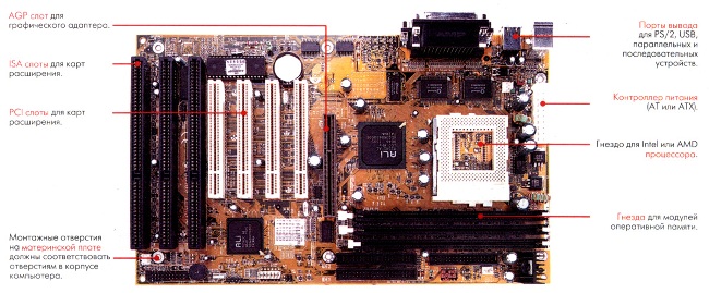 По внешнему виду материнской платы можно определить, какие нужны процессор, память и дополнительные устройства, вставляемые во внешние порты и гнезда компьютера.