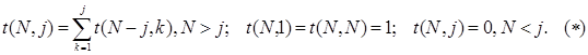 Решение. Для того чтобы подсчитать количество различных разбиений числа N на произвольные натуральные слагаемые, предварительно подсчитаем количества разбиений на следующие группы слагаемых: 1) разбиения только на единицы (очевидно, что для любого числа такое разбиение единственно); 2) разбиения на единицы и двойки такие, что хотя бы одна двойка в разбиении присутствует и т.д. Последнюю группу представляет само число N . Очевидно, что каждое разбиение числа N можно приписать только к одной из рассмотренных групп, в зависимости от значения j — максимального слагаемого в том или ином разбиении. Обозначим количество разбиений в каждой из групп t (N , j ). Тогда искомое количество разбиений равно сумме разбиений по всем возможным группам. Введение таких подзадач приводит к несложному способу подсчета числа разбиений. А именно, так как в любом из разбиений j -ой группы присутствует число j , то мы можем вычесть из N число j и сложить разбиения уже числа N – j на слагаемые, не превосходящие j . То есть мы пришли к следующему рекуррентному соотношению:
