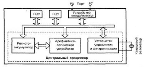 Центральный процессор (CPU) является обязательным узлом любого микропроцессорного устройства, его ядром. В его состав входит: арифметико-логическое устройство (АЛУ); регистр-аккумулятор; логические устройства управления и синхронизации; внутренняя шина.