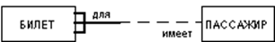 В изображенном ниже примере связь между сущностями БИЛЕТ и ПАССАЖИР связывает билеты и пассажиров. При том конец сущности с именем "для" позволяет связывать с одним пассажиром более одного билета, причем каждый билет должен быть связан с каким-либо пассажиром. Конец сущности с именем "имеет" означает, что каждый билет может принадлежать только одному пассажиру, причем пассажир не обязан иметь хотя бы один билет.