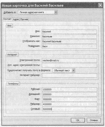 В окне адресной книги отображается список всех сохраненных в ней адресов. Чтобы записать в книгу новый адрес, в программе Outlook Express щелкните на кнопке «Создать» и выберите в открывшемся меню пункт «Создать контакт». В программе Mozilla Firebird достаточно нажать кнопку «Создать карточку».