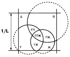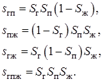 Більш коректно колір описується аналогічними рівняннями, де кількість S базових кольорів виражено імовірностями їхнього утворення через відносні площі растрових точок трьох фарб SГ , SП , SЖ.