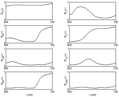 – спектральні коефіцієнти відбивання восьми колірних складових Нейгебауера. Вони показані на рис. 3.