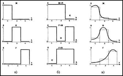 Загальні ідеї тріадного поліграфічного синтезу кольору зручно ілюструвати, прийнявши допущення, практично прийнятні лише для так званих ідеальних фарб, що характеризуються П-подібними спектральними кривими (рис. 4а) та рівномірно поглинають світлову енергію в одній зоні спектра і відбивають її в двох інших.