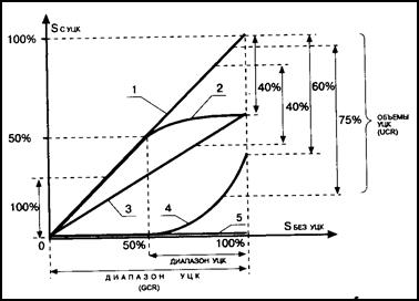 Обидва параметри пояснює рис. 6, графіки якого відображають варіанти співвідношення відносних площ точок трифарбового сірого до і після операції «УЦК». Так, графіку 1 відповідають нульові значення обох параметрів «УЦК», коли сірий колір передається в усьому його інтервалі тільки кольоровими фарбами.