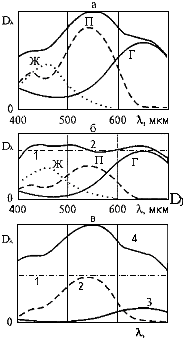 На рис. 8 (в) показано, як шляхом додавання кривих спектрального поглинання гранично чорного зображення 1, пурпурної 2 і блакитної 3 отримуємо необхідну криву спектрального розподілу оригінального зразка