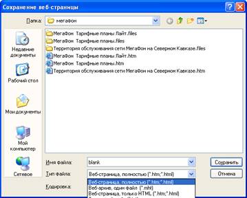 Команда "Сохранить как" дает возможность записать выбранную страницу на диск в виде гипертекстового файла в формате HTML.