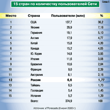 По данным компании "Computer Industry Almanac Inc." к концу 1998 года в мире насчитывалось более 147 миллионов пользователей Интернета, что на 61 миллион больше, чем их было в 1996 году. В США живут свыше 76 миллионов пользователей Интернета или примерно 52% от их общего числа. На долю 15 стран, перечисленных в таблице, приходилось примерно 89% всех пользователей Интернета в конце 1998 года. В это число входят взрослые пользователи Сети, обращающиеся к ней на работе и дома.