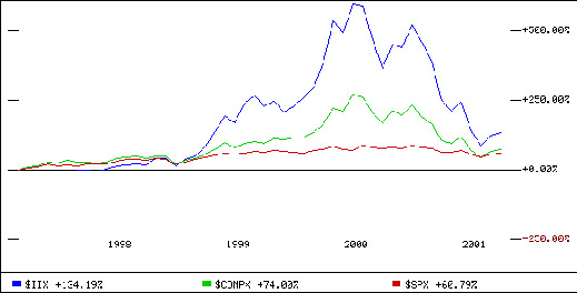 Одним из важных критериев состояния рынка финансисты считают биржевые индексы, отражающие среднюю рыночную стоимость основных предприятий того или иного сектора экономики. Успешность компаний, работающих в сфере традиционного бизнеса (изготовление и продажа тапочек, добыча полезных ископаемых, их переработка и т.д.) оценивается индексом S&P 500 Index ($SPX). Состояние компаний, деятельность которых связанна с высокими технологиями, отражает NASDAQ Composite Index ($COMPX). Успешно ли развиваются компании, бизнес которых связан с Интернетом и интернет-технологиями, оценивает индекс AMEX Inter@ctive Week Internet Index ($IIX). В значениях индекса $IIX отражаются успехи развития или кризисные моменты в деятельности 50 ведущих интернет-компаний мира, среди которых Amazon.com, America Online, BroadVision, DoubleClick, eBay, Excite, Macromedia, Yahoo. Наложив графики изменения капитализации этих трех индексов за период с 1997 по 2001 год друг на друга, мы получим следующую картину (График №1).
