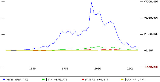Рост стоимости интернет-компаний тянет за собой рост стоимости компаний, задействованных в сфере высоких технологий. Дальше мы имеем эффект пирамиды МММ, хотя и более сглаженный. Завышенный курс акций интернет-компаний не может держаться долго, и в начале 2000 года начинается их падение, которое заканчивается в феврале 2001 года. Стоимость одной акции Yahoo на 19 мая 2001 года составила $19.5 что составляет +580% по сравнению с 1997 годом и +0% по с 1998 годом. Данные опроса 1338 пользователей сети Интернет относительно их финансового состояния, проведенного финансовой компанией MONEY и сан-францисской фирмой венчурного капитала Rosewood Capital, показали, что 80% опрошенных интернет-инвесторов имели дивиденды менее чем 10%, сюда входят и 29% потервших деньги. Какие выводы можно сделать из вышесказанного? Все уже позади. Интернет по-прежнему будет расширять свое влияние на нашу жизнь, но он уже не является уникальным рынком, живущим по своим сверхажиотажным законам. Интернет влился в общий мировой рынок, и стоимость интернет-компаний теперь будет скорее зависеть от их финансовых показателей, нежели от принадлежности к интернет-бизнесу.