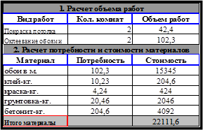 Объем работ рассчитывается инвариантно, т.е. при помощи функции «ЕСЛИ» в зависимости от количества комнат:
