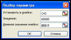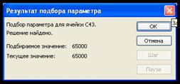 При выполнении подбора параметров устанавливаем расходы по смете 65 000 руб. и задаем подобрать размер цены на обои (см. рис. 10 и 11):