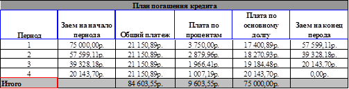 | Период | Заем на начало периода | Общий платеж | Плата по процентам | Плата по основному долгу |