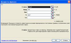 Финансовая функция БЗ используется для расчета будущей стоимости вклада. На ремонт квартиры в настоящее время согласно смете требуется 73 тыс. руб. Через три года стоимость ремонта квартиры при ставке 20% и ежеквартальном начислении процентов составит 135 тыс. руб. Окно расчета функции БЗ приведено ниже (см. рис. 6):