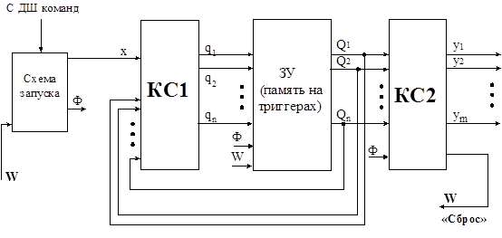 Обобщенная структурная схема (рис.1) цифрового автомата (ЦА) содержит запоминающее устройство ЗУ (RG - регистр, выполненный на триггерах), два комбинационных устройства: для формирования сигналов управления триггерами (КС1) и для формирования требуемых выходных сигналов (КС2).
