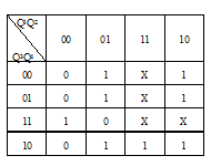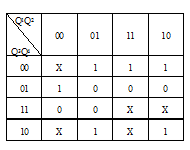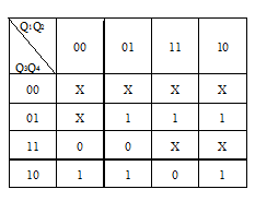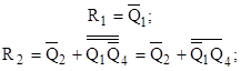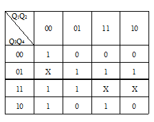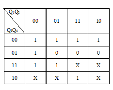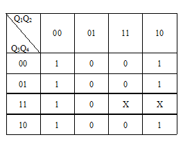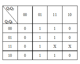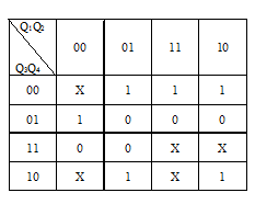 В этих картах по две клетки (комбинации 1111 и 1110) оказались не заполненными: эти клетки соответствуют неиспользованным кодовым комбинациям. Совокупность четырех триггеров, образующих регистр, может находиться в одном из шестнадцати состояний: 24=16, из которых для формирования кодов импульсов на выходе ЦА используется только четырнадцать. Эти клетки можно заполнить символами "Х". Это означает, что минимизируемая функция может при данном наборе аргументов Q1…Q4 принимать любое значение: 0 или 1.