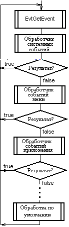 Интерфейсные приложения PalmOS управляются событиями. Такое приложение представляет собой единственный цикл, каждая итерация которого начинается с получения очередного события. Системный вызов EvtGetEvent обеспечивает ожидание и прием события. Полученное событие передается ряду обработчиков в такой последовательности: