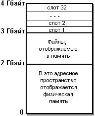 В старшей части памяти адресное пространство от 2 до 3 Гбайт отводится для совместно используемой памяти (в терминологии Windows - файлов, отображаемых в память), а пространство от 3 до 4 Гбайт делится на "слоты" с номерами от 1 до 32, каждый из которых представляет адресное пространство одного из процессов. Таким образом, в системе может выполняться одновременно до 32 процессов, частное адресное пространство каждого процесса - 32 Мбайт (не считая файлов, отображаемых в память). "Слот" 0 отображается на физическую память, он отдается активному в текущий момент процессу. В адресном пространстве каждого процесса, помимо кодов процесса, создаются области памяти для статических данных, куча и стек для каждой нити процесса. Для статических данных выделяются отдельные области памяти - для изменяемых и для неизменяемых данных. Для каждого процесса создается куча по умолчанию (384 страницы по 1 Кбайт), но процесс может создавать новые кучи в пределах своего адресного пространства. Выделенные в куче блоки памяти не перемещаются, что может приводить к фрагментации памяти в куче. Размер стека для нити - 1 Мбайт, и он не может быть изменен. Количество нитей в процессе ограничено только возможностью выделения памяти для стеков нитей. Память для стека выделяется по мере необходимости, постранично. Если для растущего стека нити не хватает страниц памяти, нить блокируется.