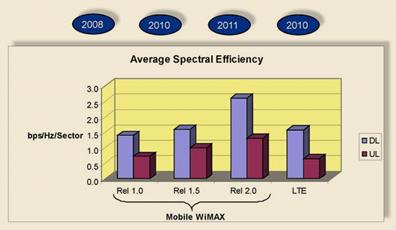 Одним из значительных преимуществ передовых беспроводных систем, таких как WiMAX является спектральной эффективности. Например, 802.16-2004 (фиксированный) имеет спектральную эффективность 3,7 (бит / с) / Hertz, а другие 3,5-4G беспроводных систем предлагают спектральной эффективности, которые схожи с точностью до десятых долей процента. Заметным преимуществом WiMAX исходит от объединения SOFDMA со смарт-технологии антенны. Это увеличивает эффективную спектральной эффективности за счет многократного использования и смарт-топологиях развертывания сети. Прямое использование частот организация домена облегчает проекты с использованием MIMO-AAS по сравнению с CDMA / WCDMA методами, в результате чего более эффективных систем.